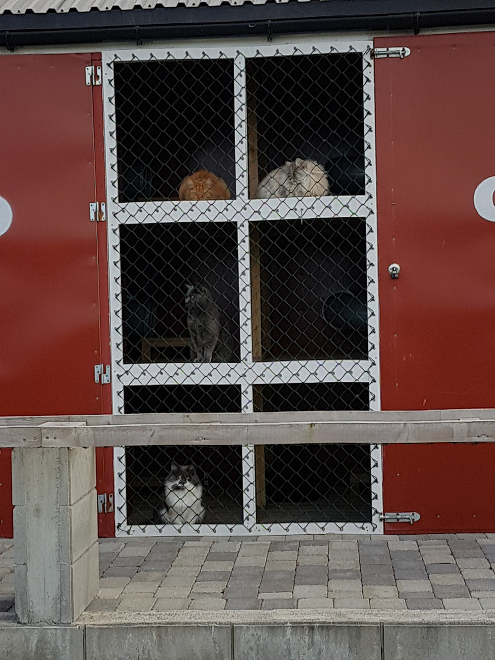 Alle kattene har tilgang til sin egen private utegarde, med gulv laget av terrassebord og masse frisk luft. Her kan de nyte hverandres selskap eller slappe av i solen.