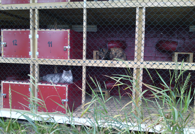 Utearealene består av gulv laget av terassebord med tak over, med netting rundt. Det er eget hus til kattedoen og det er sand av ypperste klasse oppi. Det er netting mellom hver av utegarene slik at ingen katter har fysisk kontakt med andre katter. Kattetoalettet står ute i eget hus tilknyttet den enkelte katt sitt uteareal.