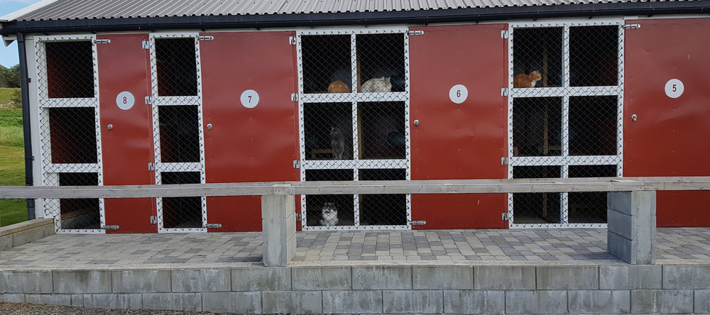 Utearealene består av gulv laget av terassebord med tak over, med netting rundt. Det er eget hus til kattedoen og det er sand av ypperste klasse oppi. Det er netting mellom hver av utegarene slik at ingen katter har fysisk kontakt med andre katter. Kattetoalettet står ute i eget hus tilknyttet den enkelte katt sitt uteareal.