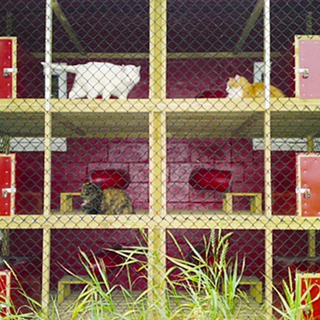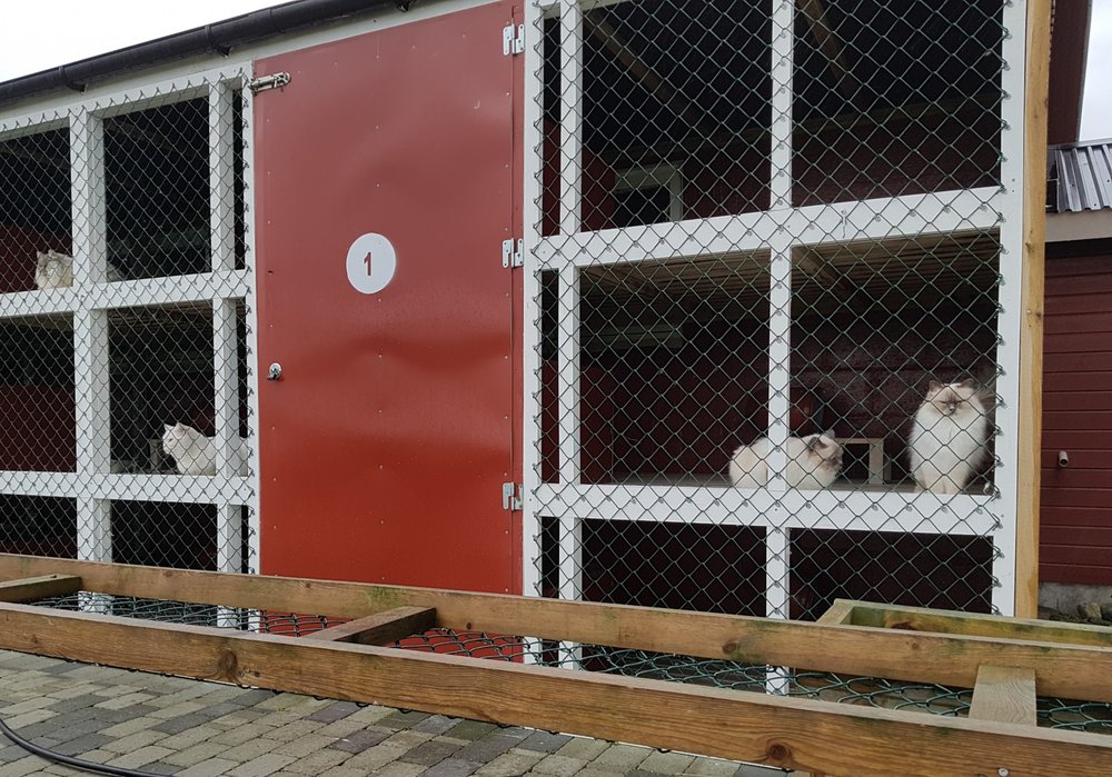 Alle kattene har tilgang til sin egen private utegarde, med gulv laget av terrassebord og masse frisk luft. Her kan de nyte hverandres selskap eller slappe av i solen.